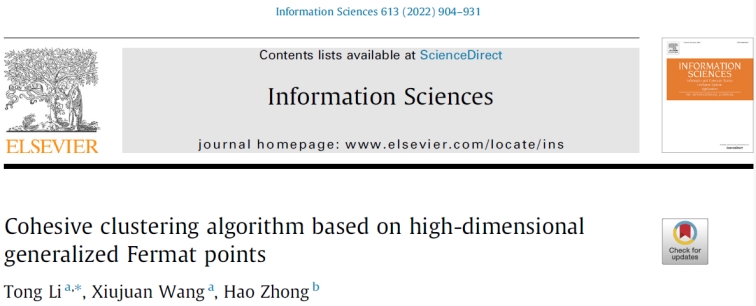 商学院、知识产权学院李彤教授课题组在国际期刊《Information Sciences》(JCR一区,IF8.233,计算机科学Top期刊)上发表题为“Cohesive clustering algorithm based on high-dimensionalgeneralized Fermat points”的研究成果。