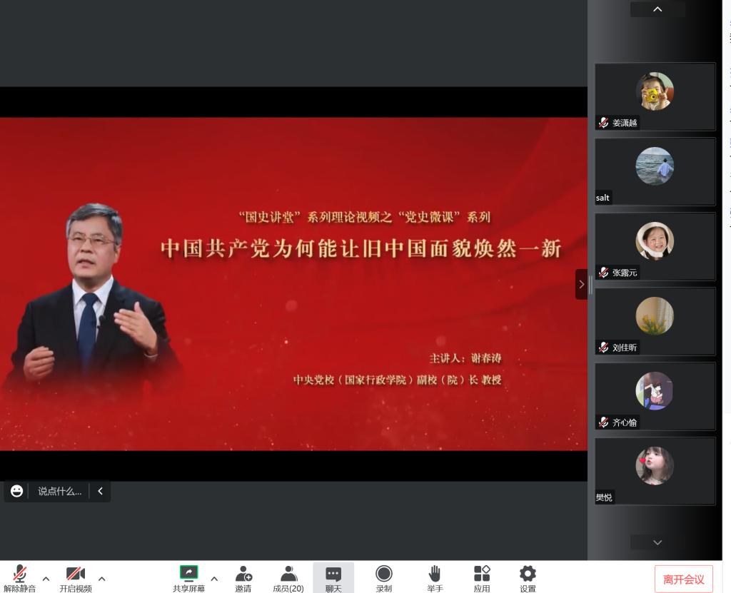 活动伊始,同学们集中观看中央党校副校长谢春涛教授的微党课视频,了解中国共产党能够建立新中国的历史原因,中国共产党自成立之日起,就始终把最广大人民根本利益放在心上,组织人民自力更生、发愤图强、重整山河,为摆脱贫困、改善人民生活打下了坚实基础,使得中国共产党的行动和政策赢得了广大人民群众的拥护。