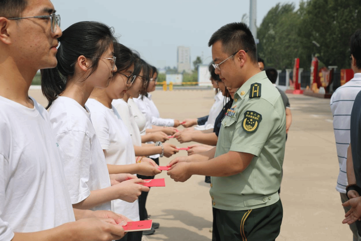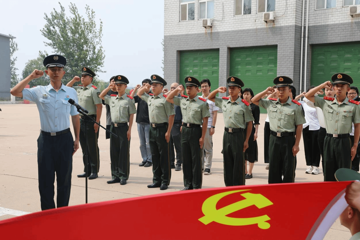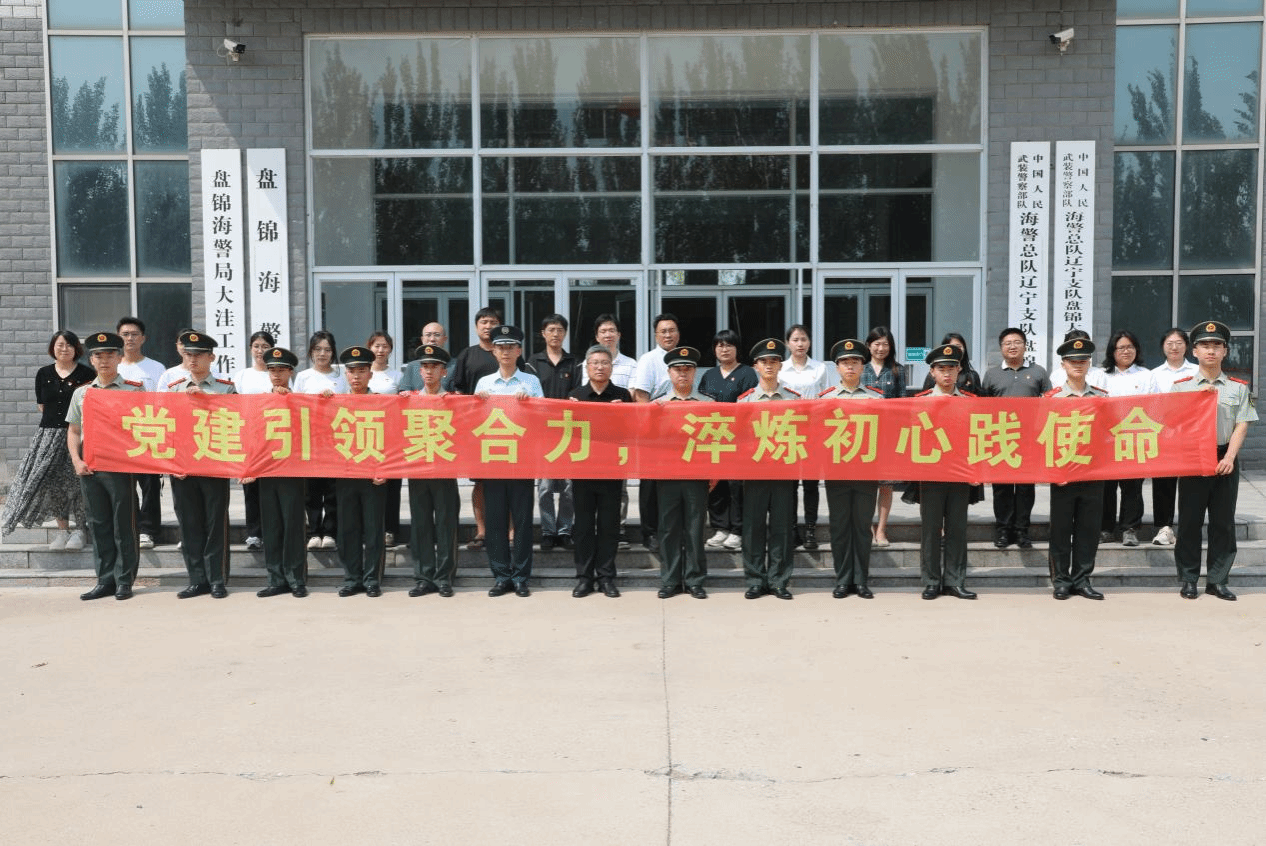 在盘锦市海警局,学院新党员与海警局新党员在领誓人的带领下,面向鲜红的党旗,举起右手握拳,庄严宣誓,郭永欣、海警局党委书记郭献才和双方全体党员一同重温入党誓词,随后党员官兵代表以及教师党员代表为双方新发展党员佩戴党徽,并赠发《中国共产党章程》。