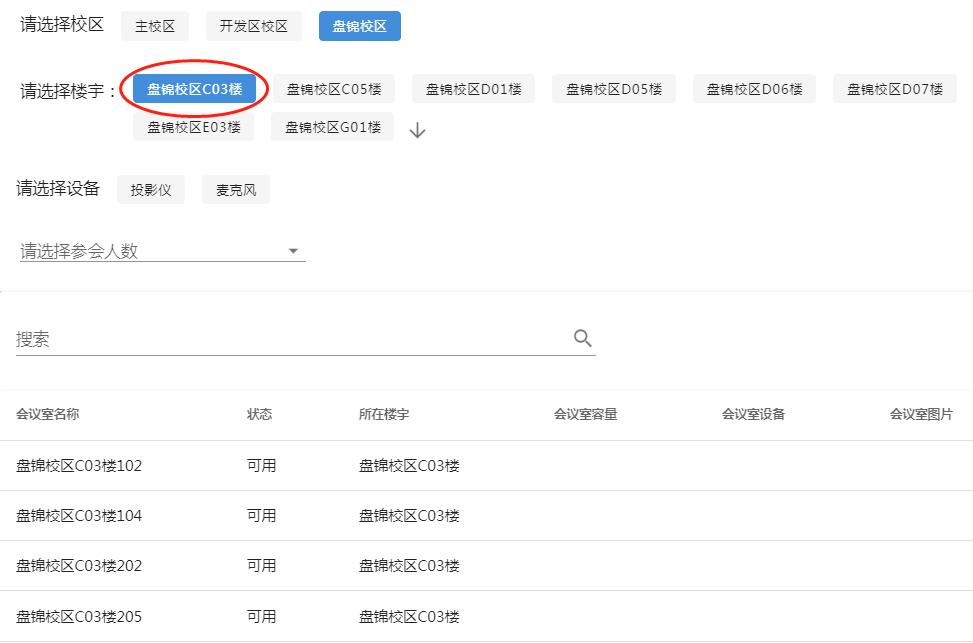 2、在会议室预约界面找到楼宇信息中的盘锦校区-C03(如下图所示), 然后根据计划预约的日期、时段,以及具体会议室进行选择,最后点击界面下方的预约,并等待关注审核结果即可。“i 大工”App 客户端登录后,同样可以在“办事大厅”模块中按照如上流程进行会议室预约。