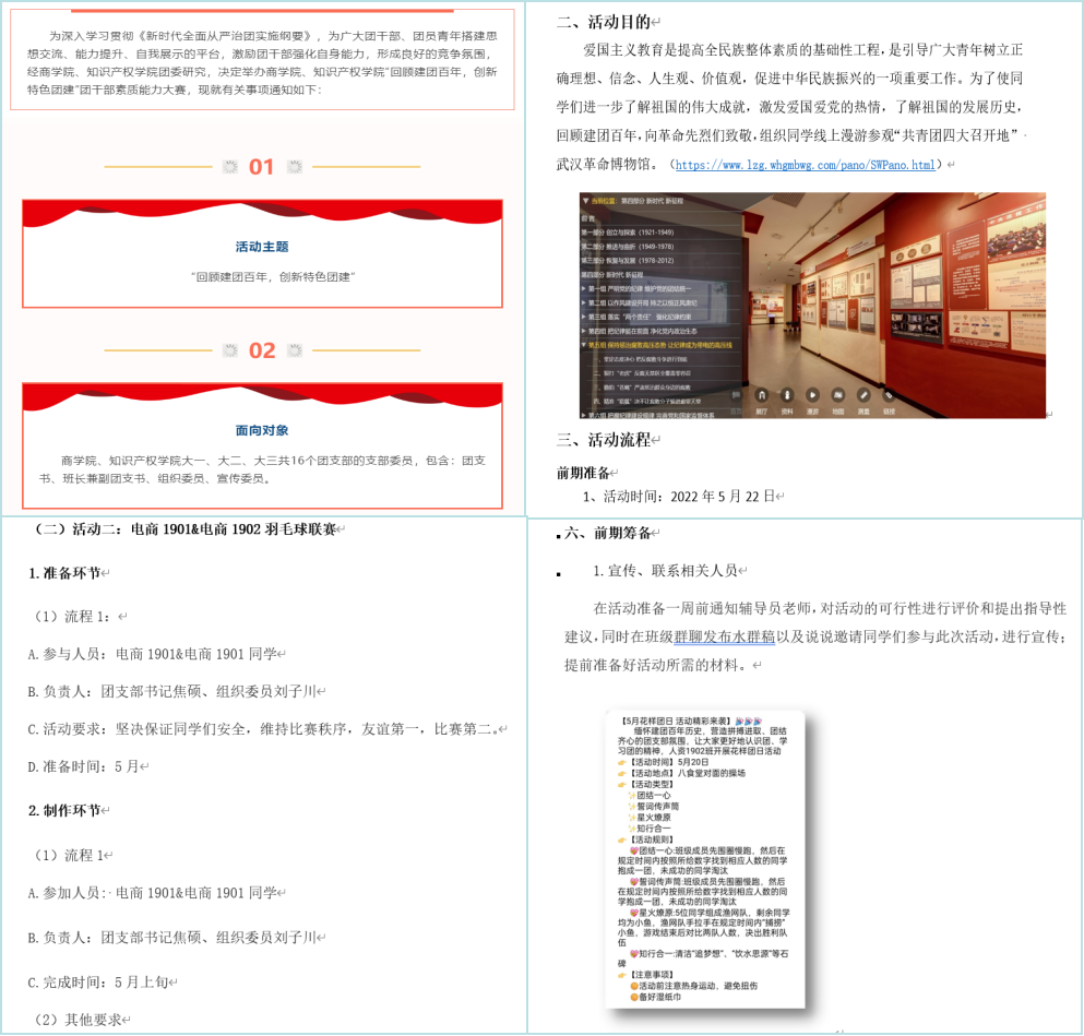 活动策划比赛展现支部战斗力。策划书大赛围绕“建团百年、回顾历史”主题,每个团支部需提交一份该主题团日活动策划书,学院团委组织部对策划书进行筛选,由教师评委针对创新性、可行性、全面性评选出一、二、三等奖,后续将对本学期各团支部团日活动开展情况进行评比。