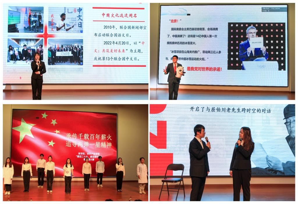 为进一步深入学习贯彻党的十九大和十九届历次全会精神,落实立德树人根本任务,弘扬伟大建党精神,推动党史学习教育常态化长效化,为党的二十大胜利召开营造浓厚氛围,商学院、知识产权学院于5月15日晚在E03报告厅举办“喜迎二十大,建功新时代”主题微课大赛决赛。本次决赛采用线下展示、线上直播的方式进行,商学院、知识产权学院党总支副书记、副院长赵博,盘锦校区党工委组织员邓娟,学院综合办公室主任王钰姬,学院党总支组织员丁晓梅和学院学生工作办公室全体辅导员老师线上线下同步担任评委,400余名观众线上观看比赛直播。
