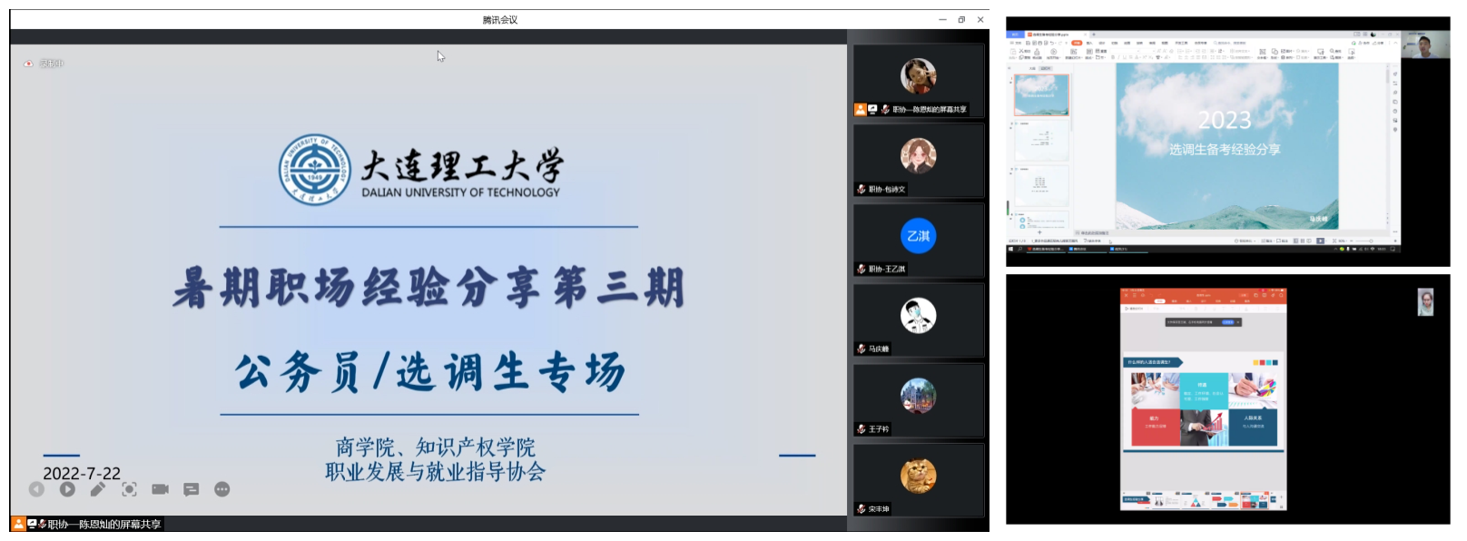 为进一步贯彻落实学院实践育人理念,帮助商知学子熟悉了解公务员/选调生的备考流程和申请企业实习的经验方法,商学院、知识产权学院依托职业发展与就业指导协会,利用暑期和小学期先后举办了公务员/选调生备考经验分享会和暑期实习经验分享会,分别邀请已经在公务员/选调生岗位上工作一年的三位2021届毕业生校友和具有丰富暑期实习经历的13位同学进行分享,160余位商知学子参加分享会。