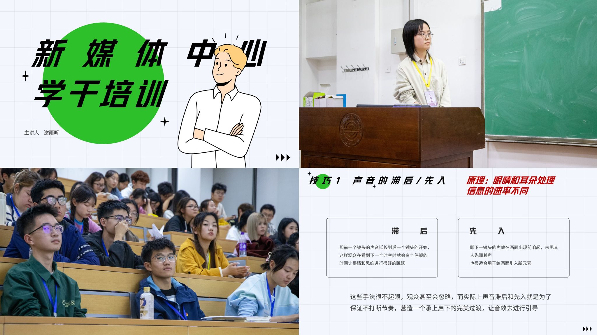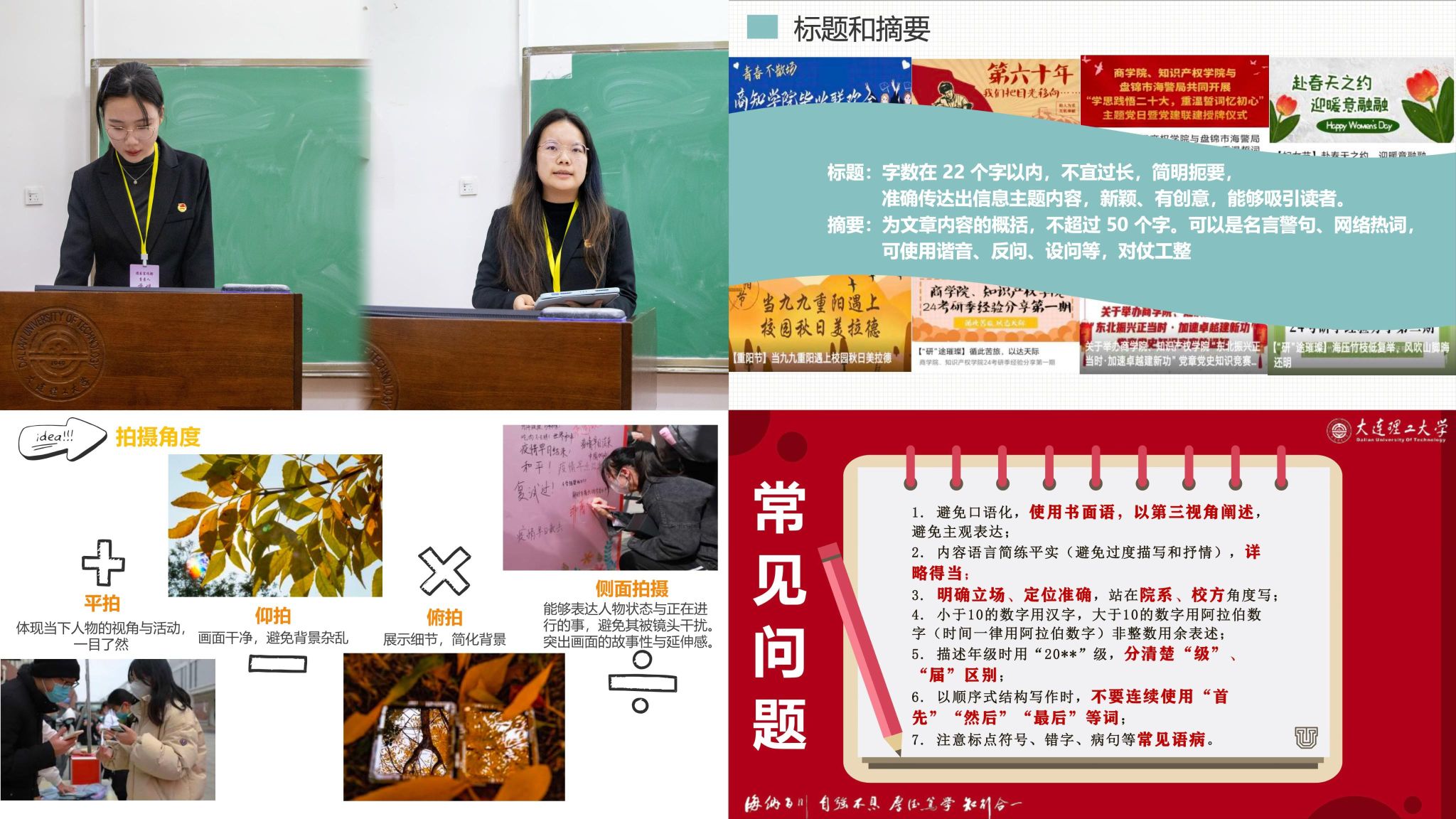 新媒体中心分别从前期准备、脚本撰写、拍摄技巧和后期剪辑四个方面带来视频制作培训,详细的介绍了镜头构成方式、运镜方式,并介绍了常用剪辑软件和使用方式。宣传部则分别从采编、拍摄和新闻撰写三个方面展开培训,针对各部门在投稿过程中的常见问题进行总结,对于各类文案编辑和图片拍摄技巧进行指导,并着重强调了对于新闻稿件、微信推送、活动总结的规范性撰写要求。