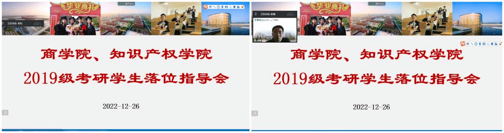 为进一步帮助学院2019级考研学生梳理落位思路,明确落位方向,做好寒假规划,商学院、知识产权学院于12月26日借助腾讯会议举办考研学生落位指导会。商学院、知识产权学院副院长李彤,党总支副书记、副院长赵博和学办主任、毕业年级辅导员王常有共同指导帮助考研学生做好下一阶段发展规划,学院100余名2019级考研同学线上参会。
