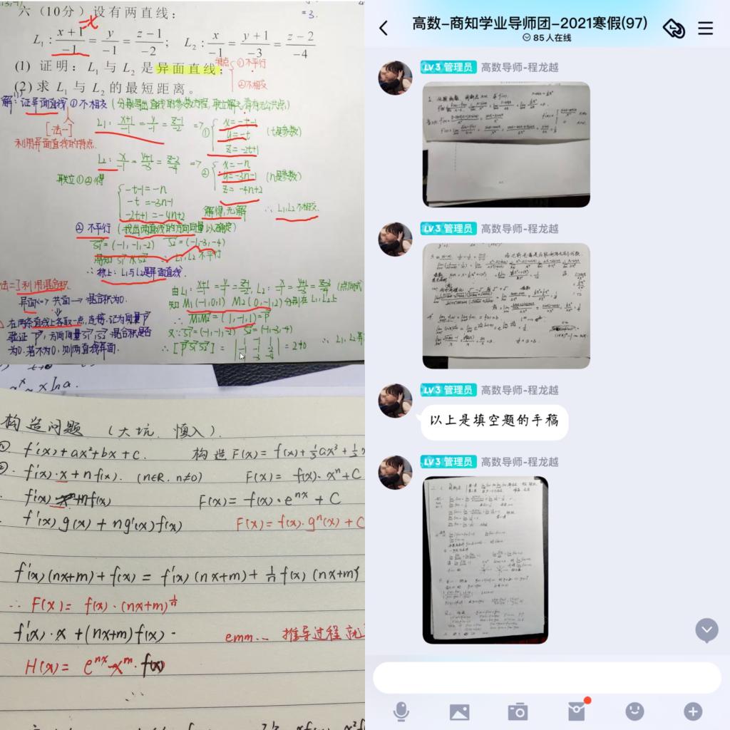 为帮助学院2020级部分同学解决高数课程学习困惑,进一步发挥朋辈辅导在学院学风建设中的重要作用,商学院、知识产权学院组织开展寒假线上高数课堂,邀请高数期末考试成绩优异学生在线答疑解惑,本次活动于2月1日开始,2月4日结束,共计开展6次线上高数授课。