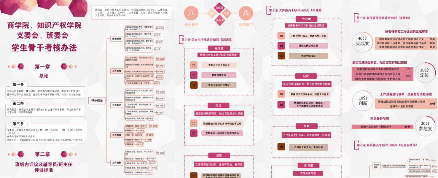 优化考核制度。学院团委制定发布《大连理工大学商学院、知识产权学院团支部、班委会学生骨干考核办法(试行)》,对学院基层团支部学生骨干日常工作提出明确要求,为进一步规范基层团支部建设,深入推进班团一体化进程,激发学生班级活力,提升学生骨干综合素质发挥了重要作用。