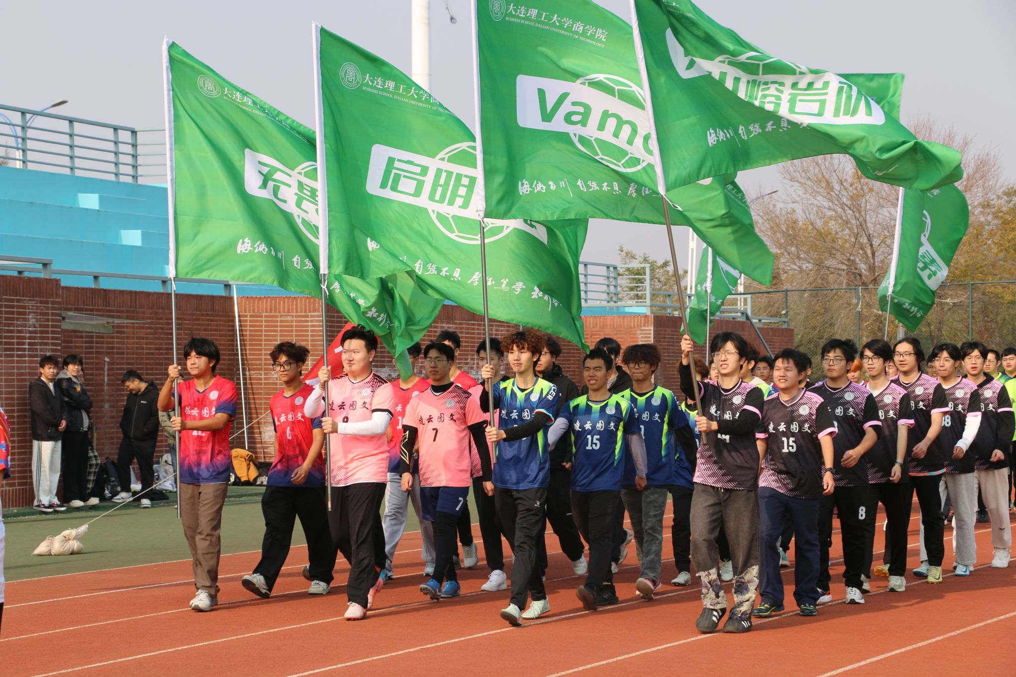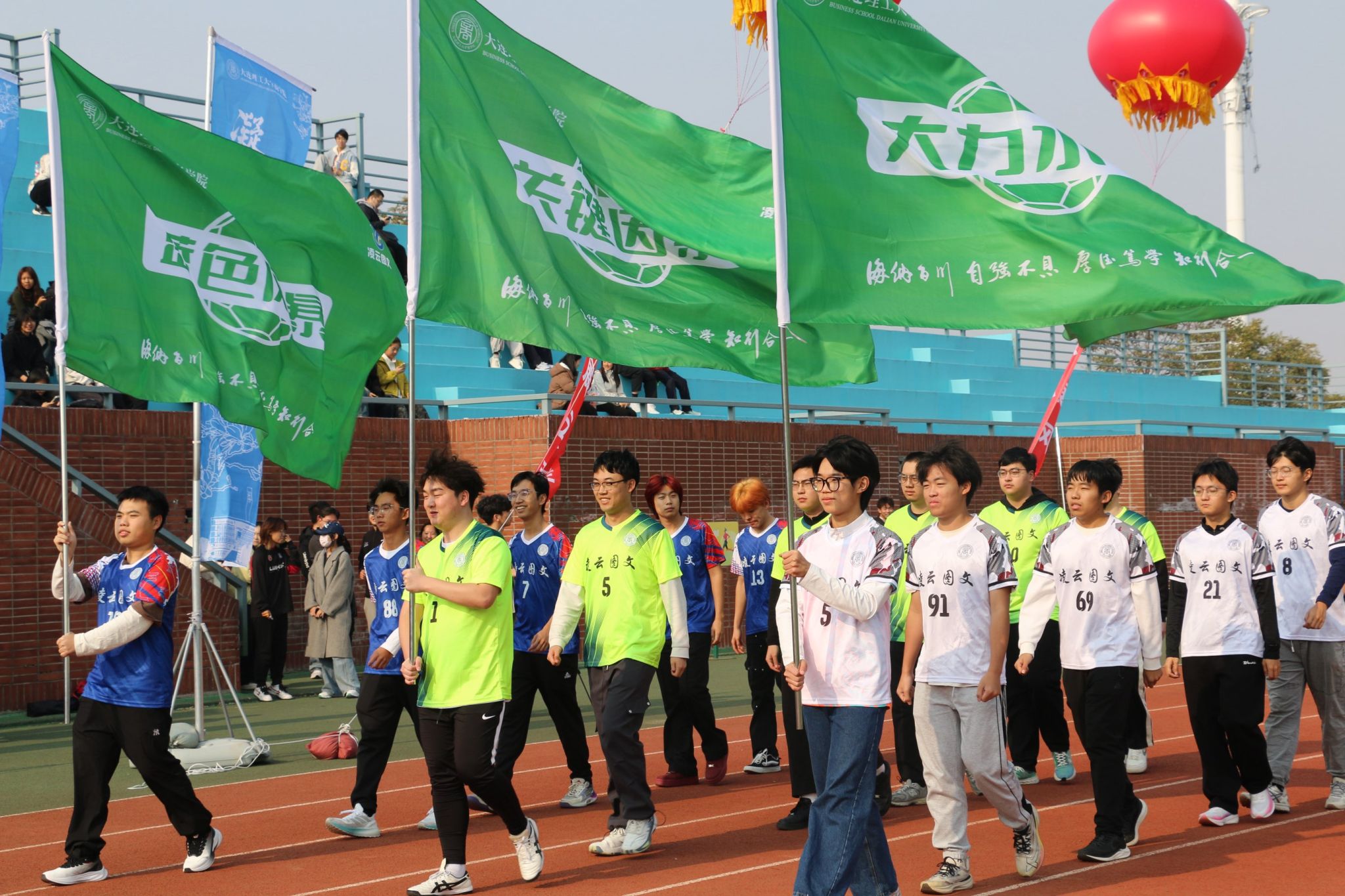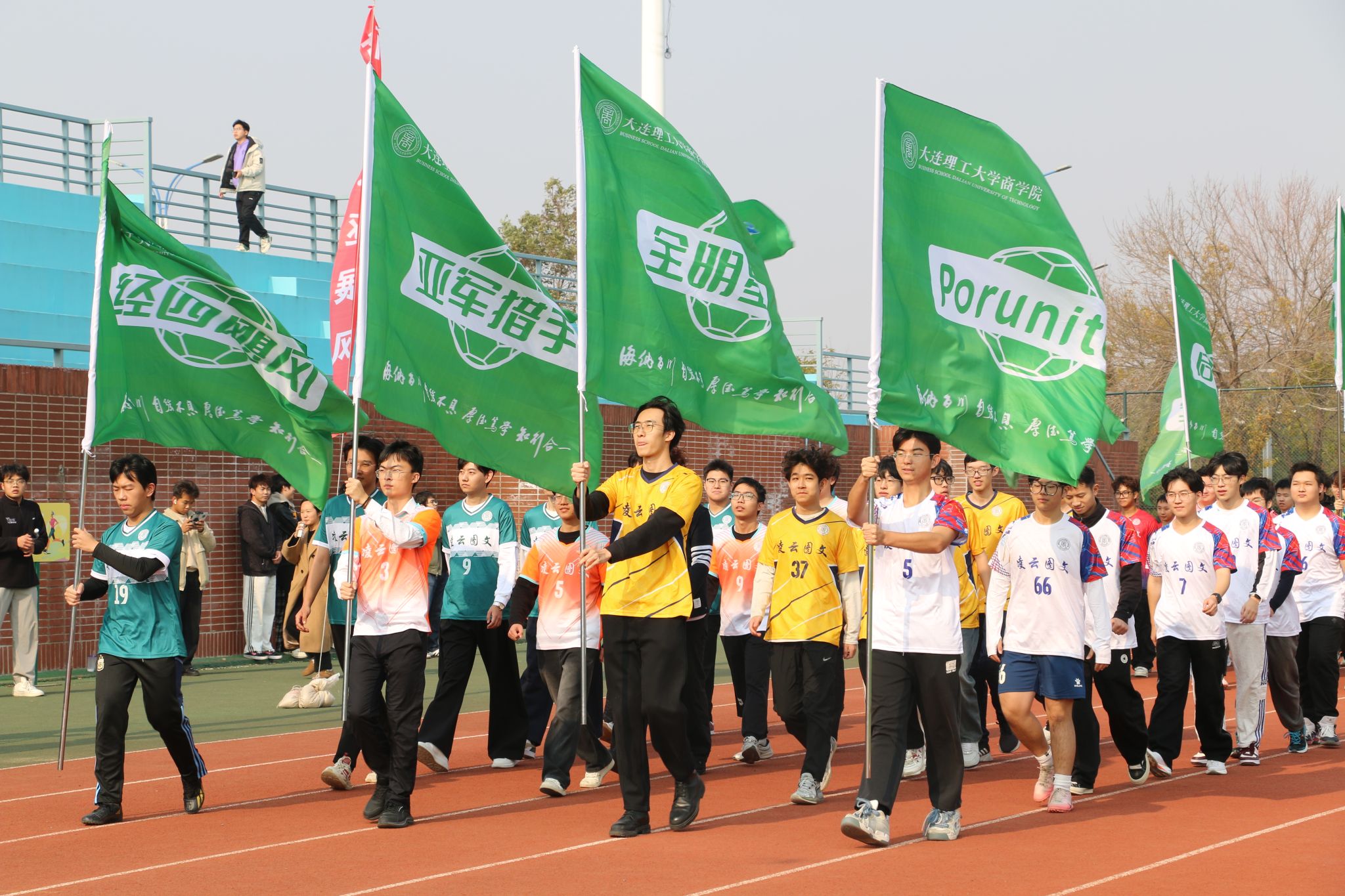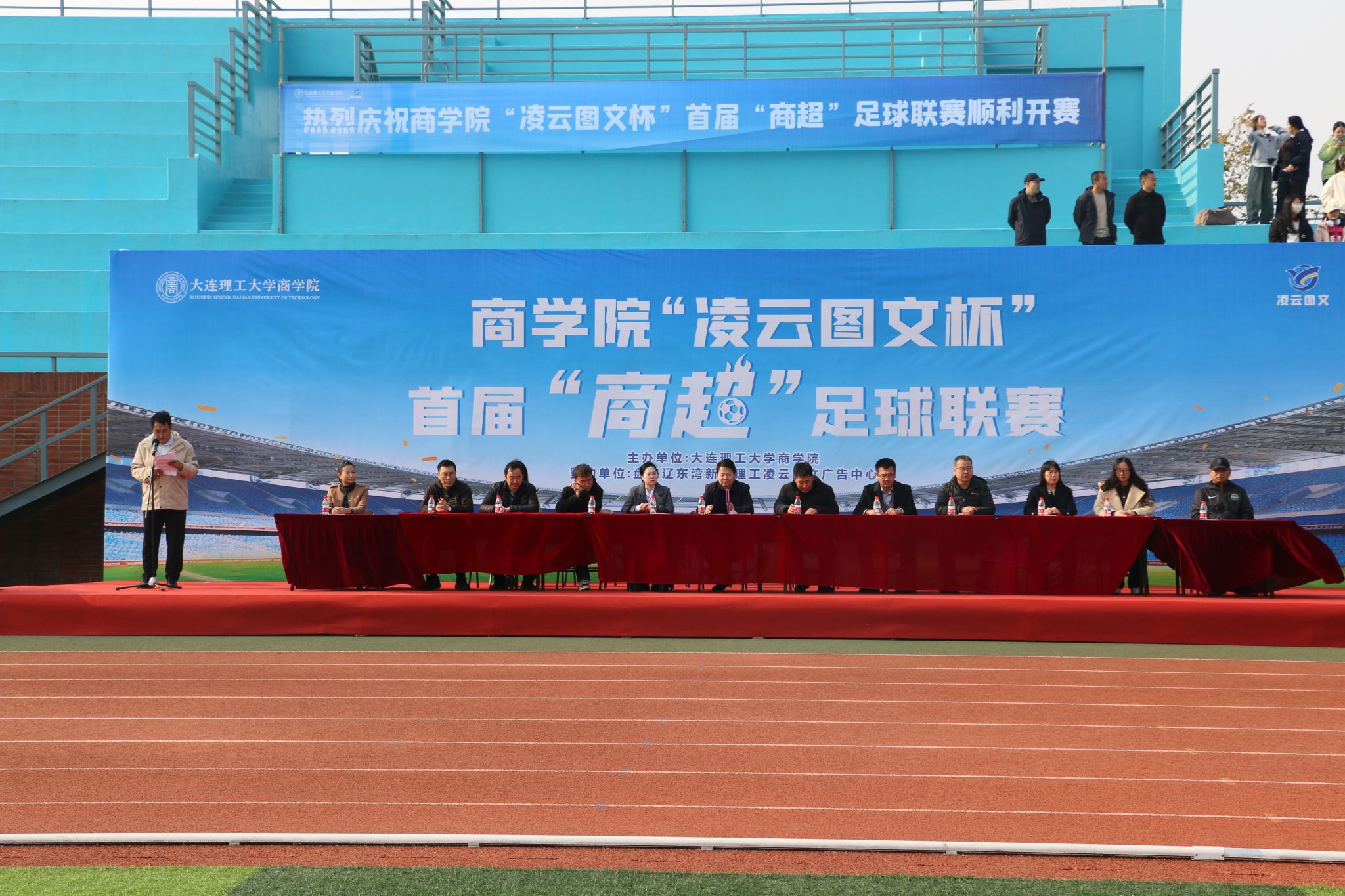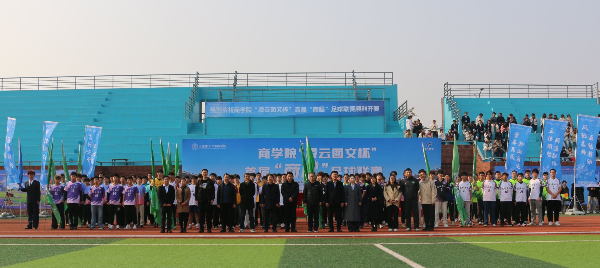 11月5日中午,商学院“凌云图文杯”首届“商超”足球联赛在盘锦校区大操场拉开大幕,商学院院长洪勇,校区教学与科研工作部副部长王春鹏,校区财务办公室主任吕明达,校区总务部副部长金刚、岳宏博,化工海洋与生命学院党委副书记张婷婷、副院长李武林,莱斯特国际学院党委副书记赵玲玲,公共基础学院党总支副书记李刚,公共基础学院足球教师、国家一级运动员&裁判员夏一冰,商学院副院长石丹、院长助理崔丽,本届联赛赞助商盘锦辽东湾新区理工凌云图文广告中心总经理吕晶出席开幕式,仪式由商学院学办主任王常有主持。