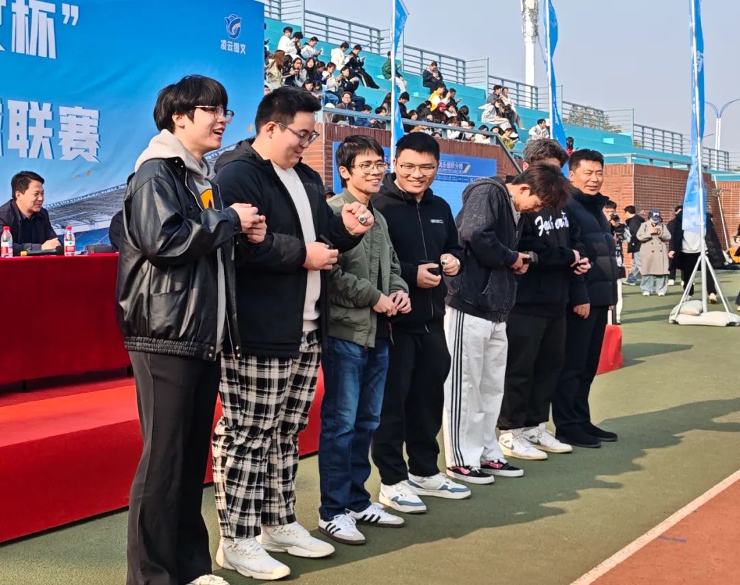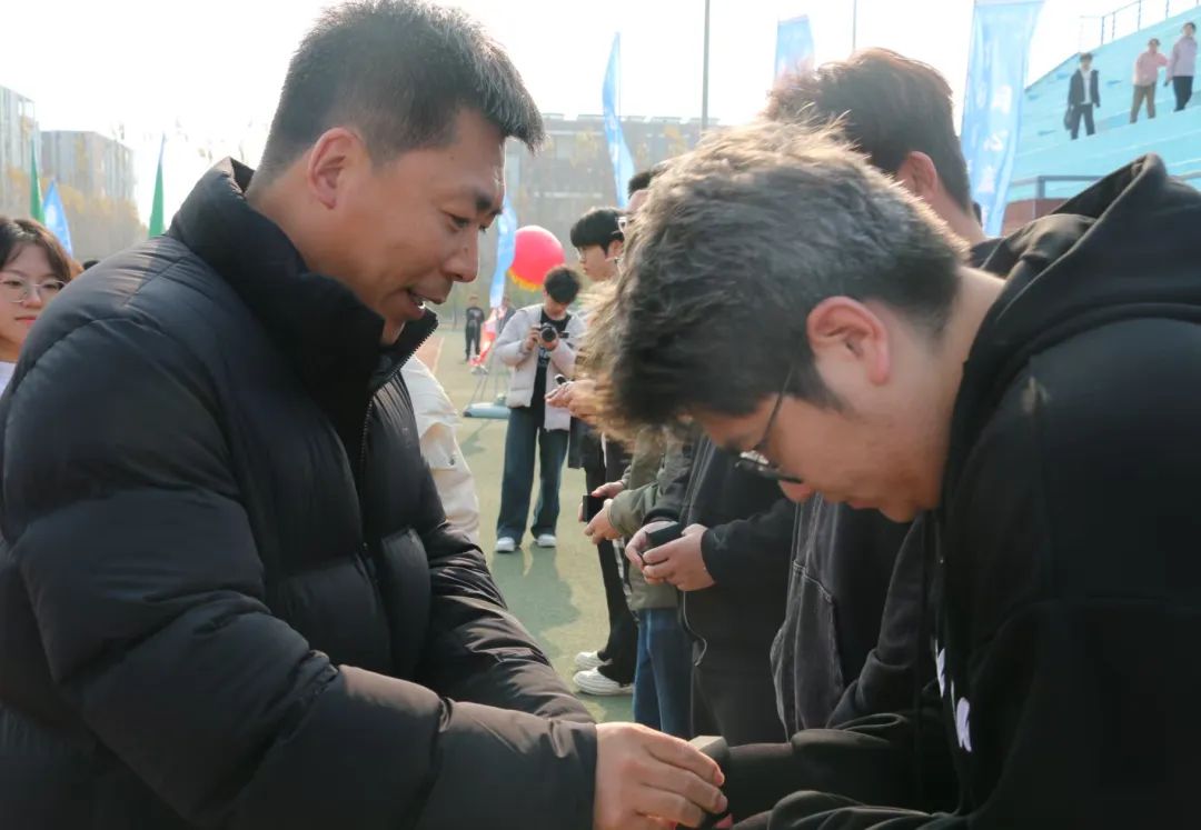 同时,商学院首届“商BA”篮球联赛冠军队伍经济类2202班全体队员受邀来到“商超”足球联赛开幕式现场,盘锦校区教学与科研工作部副部长王春鹏为队员们颁发冠军戒指。