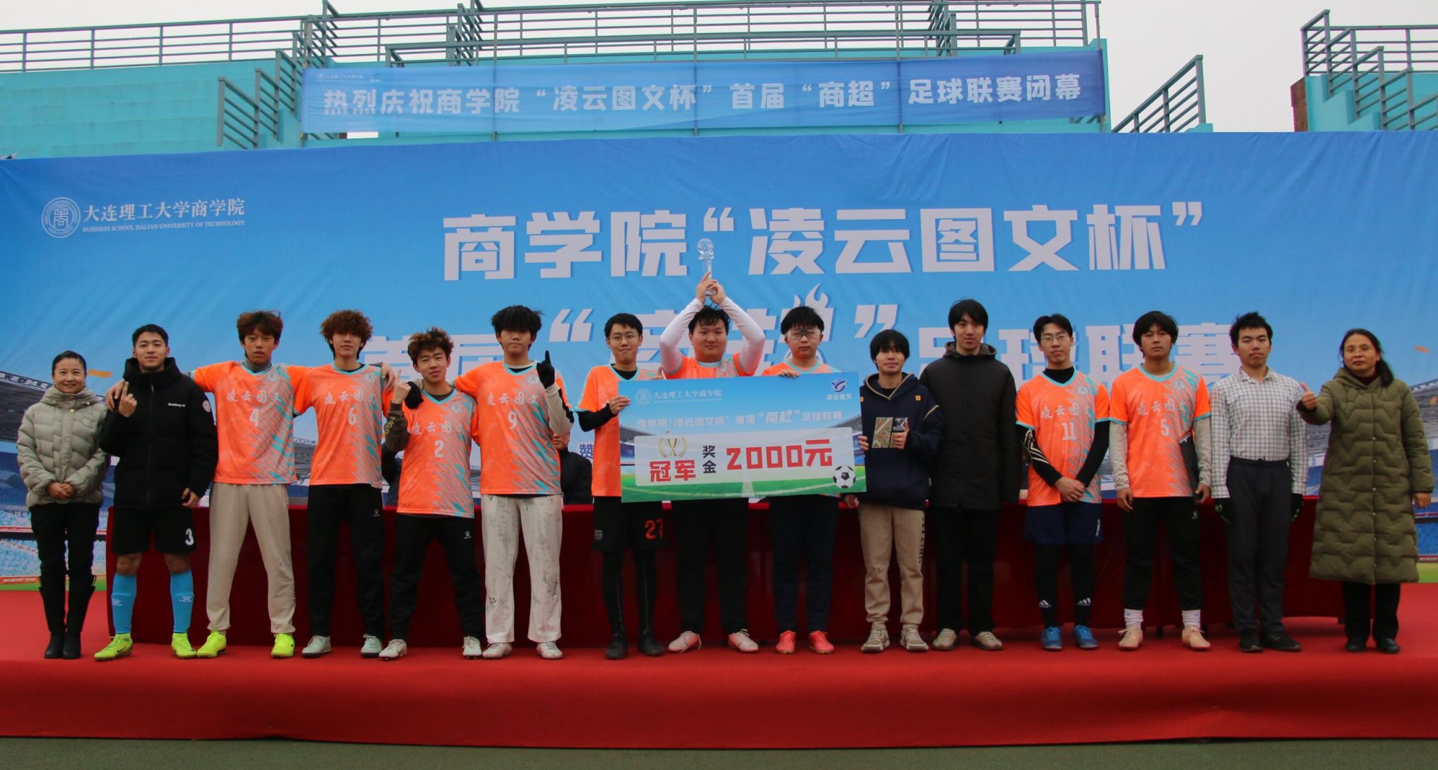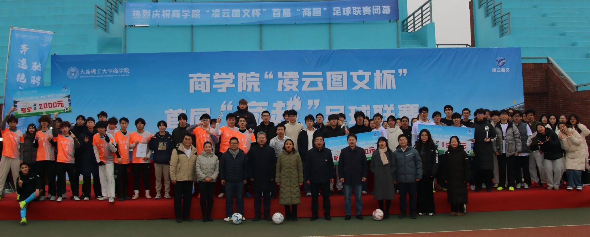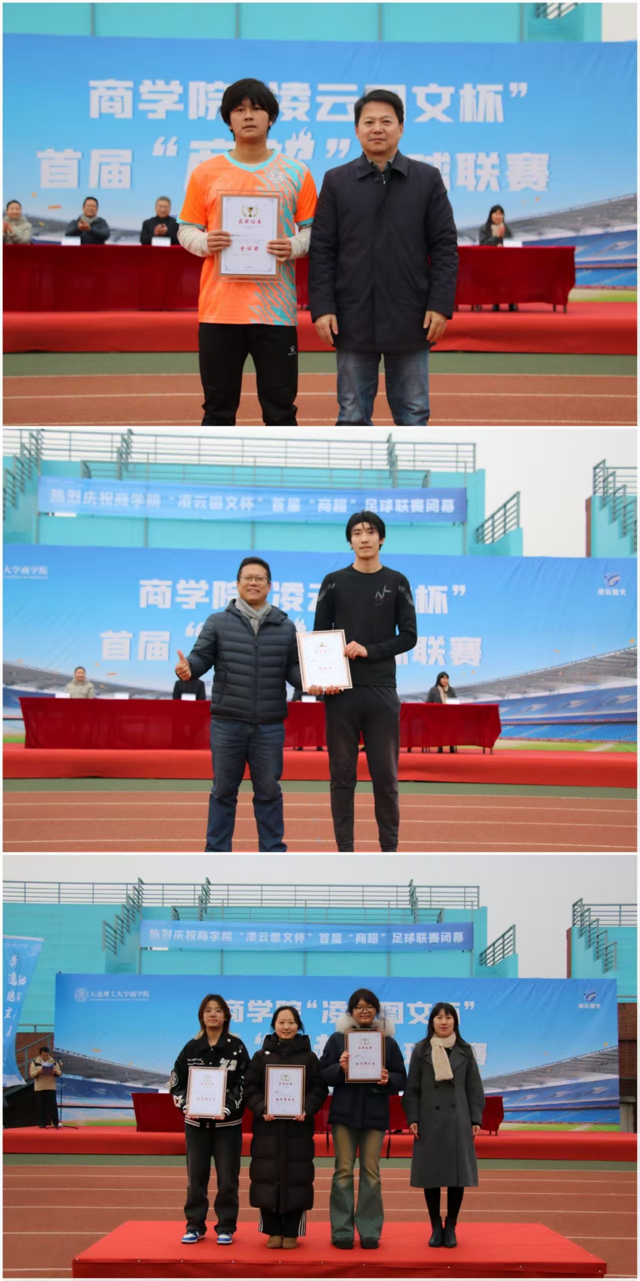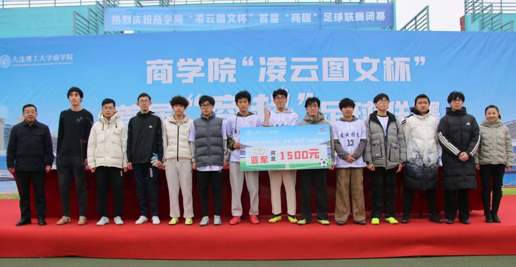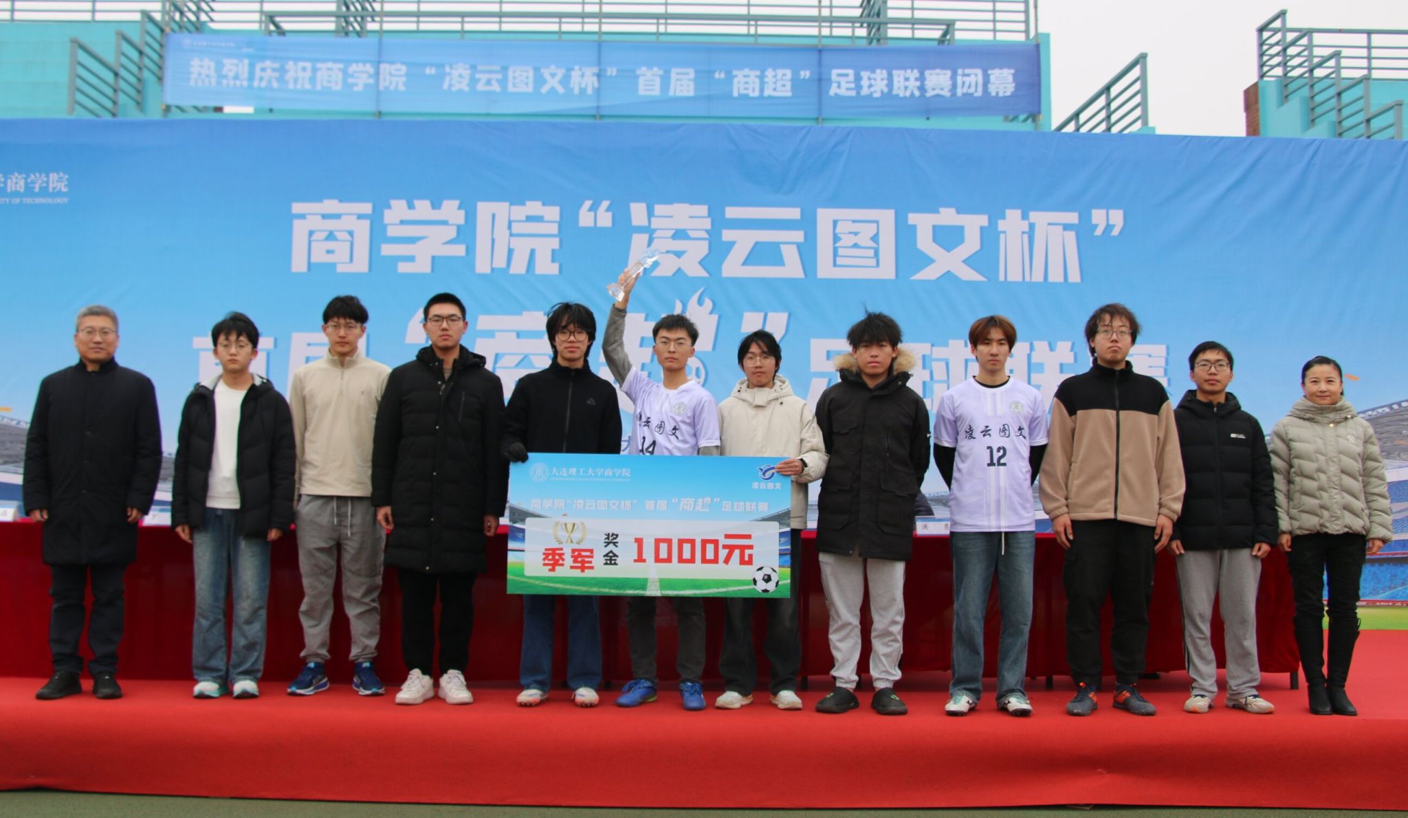 12月19日中午,商学院“凌云图文杯”首届“商超”足球联赛决赛暨闭幕式在盘锦校区西门大操场隆重举行,校区党工委副书记兼管委会副主任、校区体育运动委员会常务副主任杨晓英,校区管委会副主任兼总务部部长于晓旭,商学院党委书记郭永欣,商学院院长洪勇,商学院党委副书记、副院长罗利,商学院副院长石丹,本届联赛赞助商盘锦辽东湾新区理工凌云图文广告中心总经理吕晶出席闭幕式并为获奖队伍和获奖个人颁奖,闭幕式由商学院学办主任王常有主持。