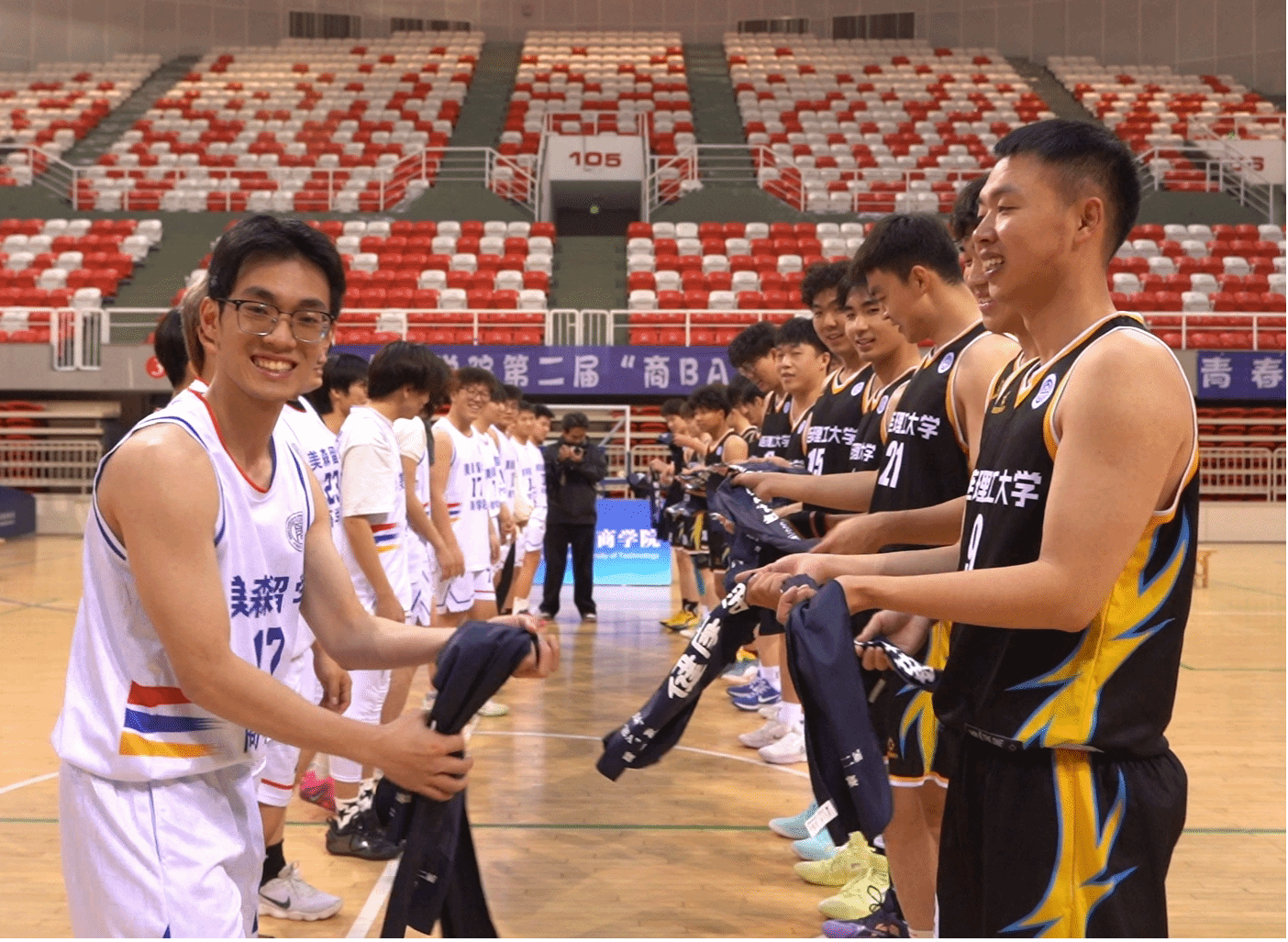 揭幕赛上,来自机械、公管、中白、建工、化工、能动、建艺等学院15名队员组成的阳光组篮球队,在王磊主教练的带领和现场指导下,与来自商学院14个班级15名队员组成的商学院篮球队同场竞技、激烈角逐。双方队员轮番上阵、切磋球技,在攻防之间尽显团结协作、奋勇拼搏的青春风采,充分展现了以球会友、互促共进的良好风貌。比赛结束后,商学院篮球队赠予远道而来的阳光组篮球队纪念礼品,以篮球为纽带,深化跨校区交流与友谊。