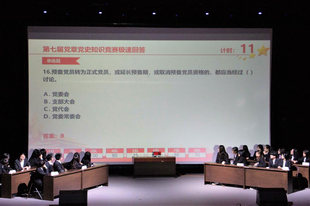 经过初赛激烈角逐,共有24名同学晋级学院复赛,3人一组共8支队伍在复赛现场进行了火热比拼。复赛分为“积分筑垒”、“极速回答”、“你选我答”以及“险中求胜”四个环节。在比赛各个环节,选手们从容不迫,回答问题迅速准确,各组比分你追我赶,交替攀升,比赛现场气氛热烈。参赛选手们的精彩表现充分展现了其扎实的党章党史知识和奋发昂扬的精神面貌。