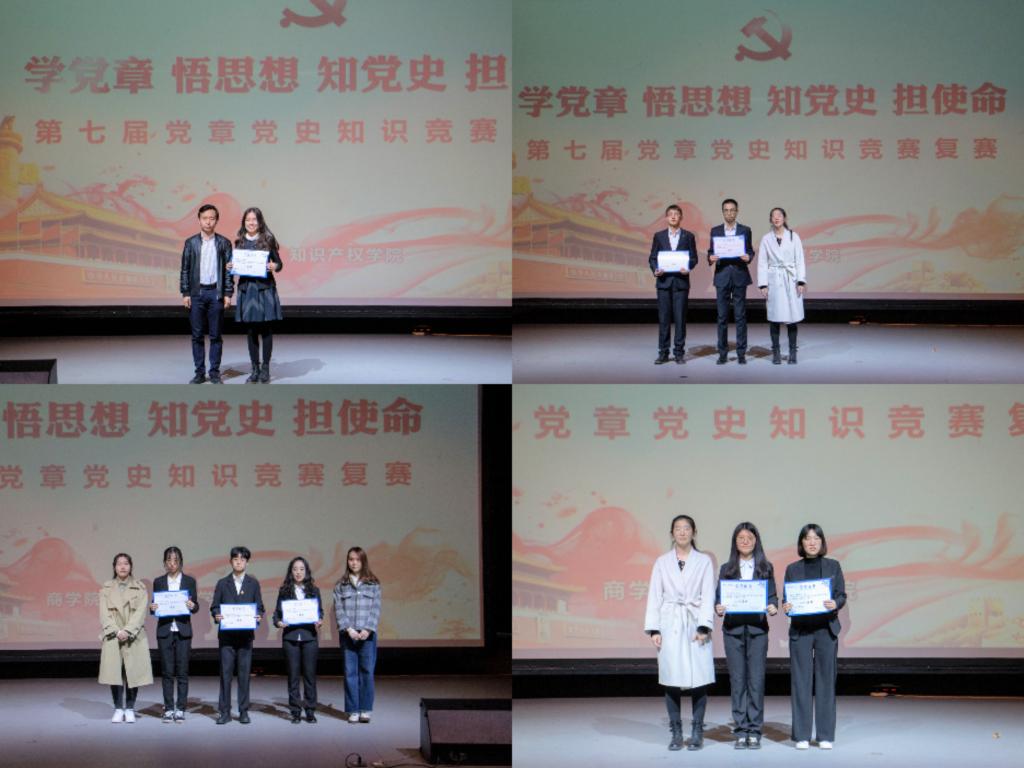 为庆祝建党100周年,重温中国共产党光辉历程,更好地继承和发扬党的光荣传统和优良作风,坚定理想信念,商学院、知识产权学院“学党章,悟思想,知党史,担使命”党章党史知识竞赛于4月11日下午14:00在E03大礼堂举办,学院辅导员肖启、晁苗苗、彭博和齐心愉出席本次比赛。