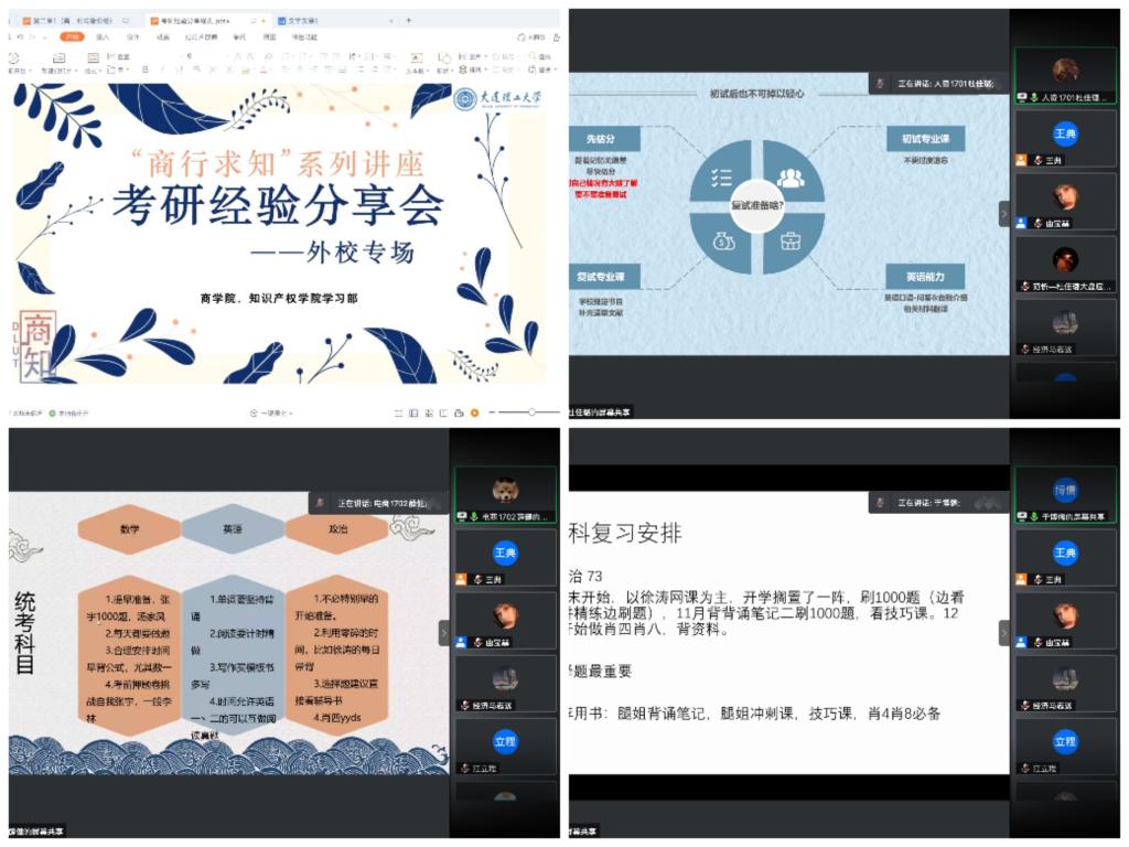 在第二期考研经验分享会中,许淞瑞同学结合当前考研形式,针对考研院校的选择等几方面为同学们做出介绍和分析。杜佳璐同学介绍了初试和复试的详细流程,对于如何应对备考期间的心理焦虑和时间分配等问题,也给出相应的解决办法。于博儒同学分享自己各科复习进度安排,介绍了在英语、政治以及专业课复习方面的一些经验和做法。薛健同学侧重于对统考科目复习安排的讲解,分享自己考研过程中的一些心得体会。