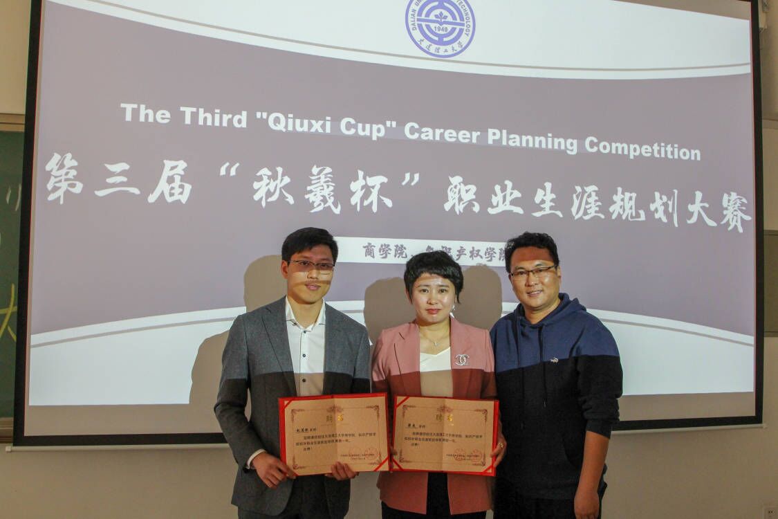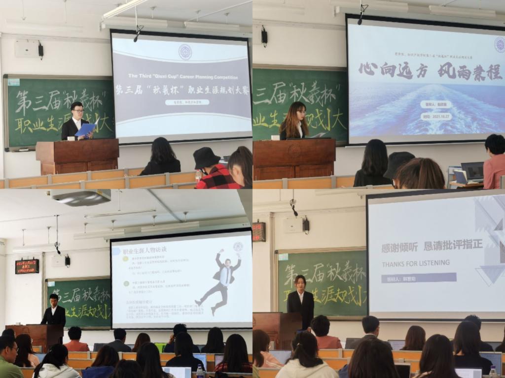 为了进一步提升学院学生职业生涯规划的意识和能力,商学院、知识产权学院于10月27日下午13:30在A01-S301教室举办第三届“秋羲杯”职业生涯规划大赛决赛。经过前期职业生涯规划书审核、选拔,共有10位同学进入最终决赛。本次决赛特邀中信证券大连五五路营业部副总经理梁爽、区域总监赵涛歌、外国语学院盘锦分院学生工作办公室主任邹靓靓和学院学生工作办公室全体辅导员老师以及15位学生代表共同担任评委。