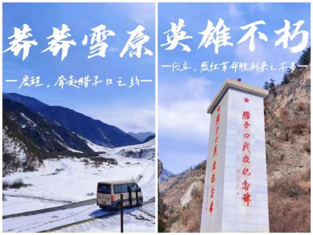 队员们乘车在莽莽雪原上行进,途径铁齿梁景观,队员们下车站在山崖的观景台上放眼南望,雪山神韵一览无余。红军战士曾翻越此处天险,千里迭山会永远记得最英勇的红军。沿隧道穿越达拉山,春天的腊子口呈现在眼前,望眼前雄关,不远处高高耸立的纪念碑令我们肃然起敬;英雄雕塑庄严雄伟,印着点点弹痕的峭壁与悬崖下的碉堡令我们陷入沉思;一个个雕塑、一盏盏红旗、一面面故事墙,如泣如诉,讲述着沧海横流中中华儿女的英雄本色,诠释着超越时空的信仰与家国情怀。