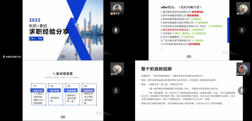 为进一步贯彻落实学校“就业促进月”相关工作安排,充分发挥学院优秀毕业生榜样引领作用,帮助商知学子更加明确未来发展方向,合理制定发展规划,商学院、知识产权学院于2022年4月先后举办就业、留学、公考和考研四场经验分享会,累计邀请15位毕业生同学分享经验,答疑解惑。