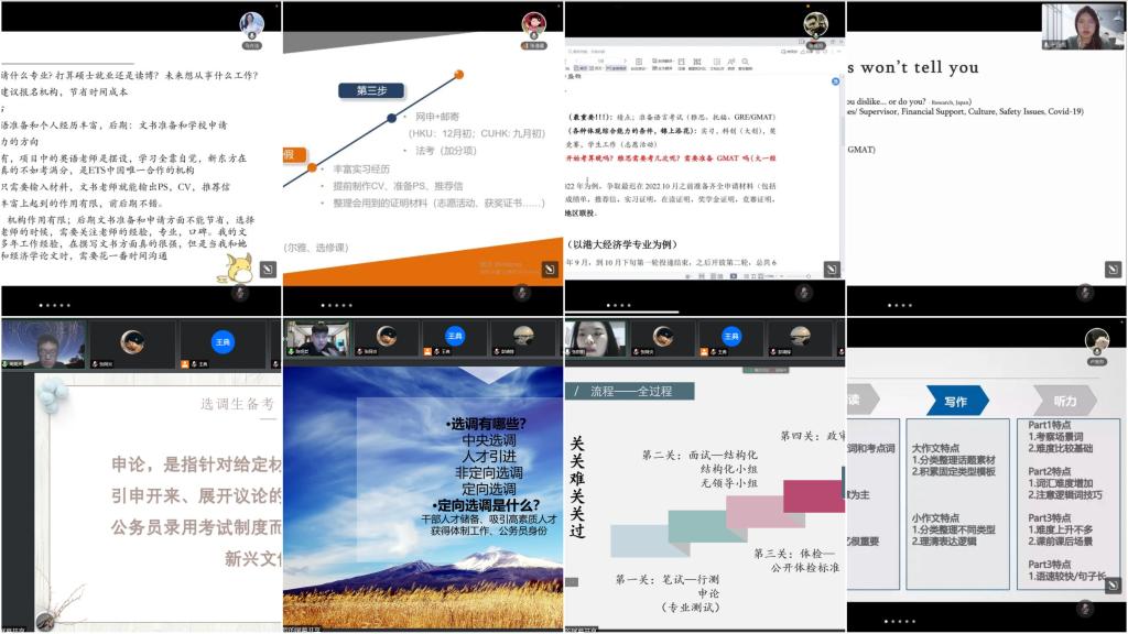 4月17日,学院举办留学经验分享会,邀请张煊阳、于丹凤、张逢露、马卉洁和卢宛彤五位同学结合自身留学申请经历,从前期择校方法、信息搜集、中介选择,中期材料准备、注意事项,后期生活费用、沟通技巧以及全程时间安排等方面进行介绍和分享。同日,举办公考经验分享会,陈哲明、周昊天两位同学简要分析当前选调趋势,并根据自身经历指出备考时需要重点关注的复习内容,张阳阳同学介绍国考的具体流程,并对报名和备考两方面做重点介绍,同时分享国考各类题型的答题技巧,强调备考心态的重要性。