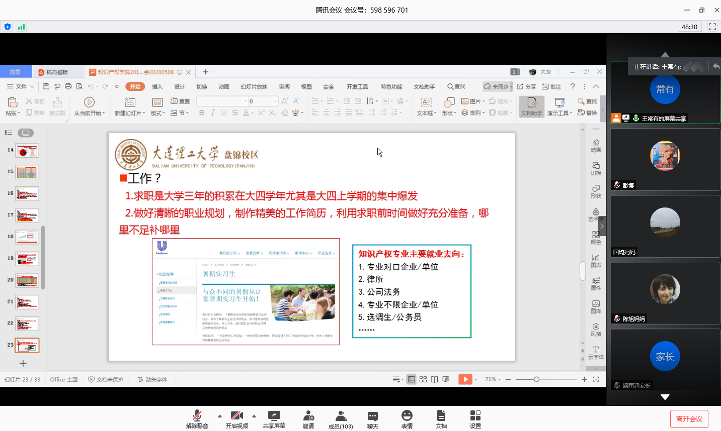 疫情防控期间,习近平总书记先后多次针对高校毕业生就业作出重要指示,“要注重高校毕业生就业工作,统筹做好毕业、招聘、考录等相关工作,让他们顺利毕业、尽早毕业”、“要抓好重点行业、重点人群就业工作,要把高校毕业生就业作为重中之重”。就业工作不仅是每位学生的大事,也是每个家庭的大事。为进一步深化家校合作,帮助学生家长了解专业就业现状,凝聚家校就业工作合力,商学院、知识产权学院于5月8日晚19:00借助腾讯会议平台举办知识产权专业2017级、2018级“云”家长会暨就业工作推进会,商学院、知识产权学院学办主任王常有老师担任主讲人,知识产权专业2017、2018级百余名学生家长参与本次“云”家长会。