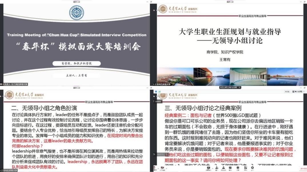3月23日,学院职协邀请学院学生工作办公室主任、《大学生职业规划》课程主讲教师王常有老师举办赛前线上培训会。王常有老师从概念和流程、面试考察中个人加分项和扣分项、角色扮演其要求、经典案例四个方面向同学们讲解了无领导小组讨论面试。同时,王常有老师还介绍了复赛、决赛流程和评委老师,引导同学们积极参赛。