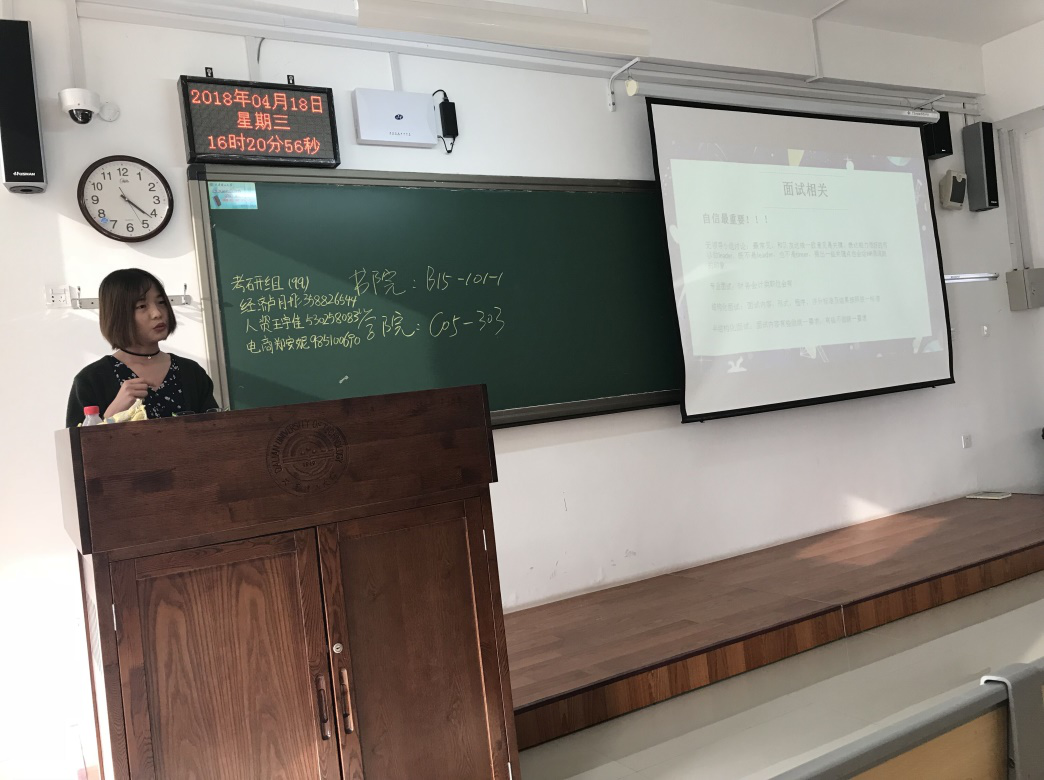 随后进行的是考研经验分享,人资王宇佳同学结合自身经验向大家分享了考研的相关情况。她向大家指出,考研前同学们首先需要进行自我评估,并在充分获取信息的基础上选择报考的专业和学校。其次要坚定信念,制定合理的复习计划,找到适合自己的学习方法。同时要注意劳逸结合,适当放松,保重身体。