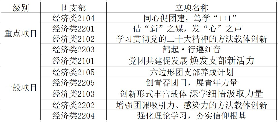 注:学院将给予重点项目资助经费300元,一般项目资助经费150元。建设经费限用于购买图书、学习资料等(符合学校财务报销标准),凭有效发票方可报销。学院将在结项答辩合格后统一予以报销,未通过结项答辩的团支部不予报销建设经费,具体时间将另行通知。